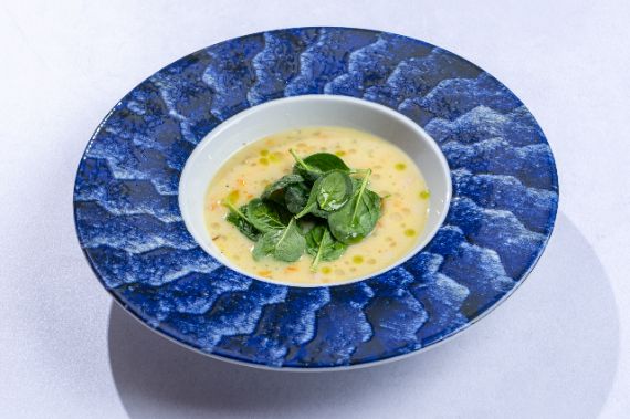 A hearty and colorful chicken soup with vegetable broth and fresh vegetables, mascarpone cream and orzo.