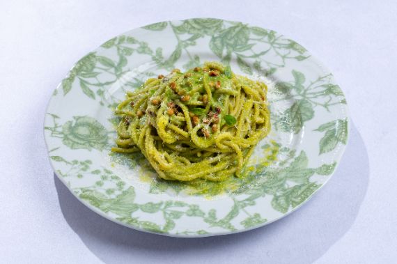 Classic Ligurian basil pesto with pine nuts and Parmigiano, tossed with spaghetti.