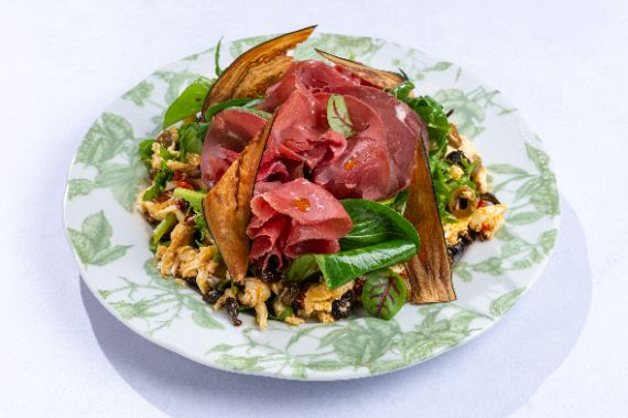 Roman-style salad of mix greens, bresaola 'cured Italian beef', mix of baked olives, served with fresh mozzarella and eggplant chips.
