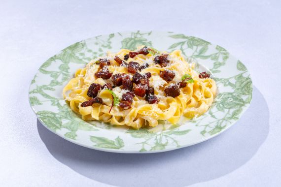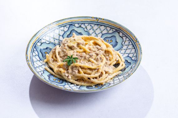 Rustic bigoli pasta served with slow-cooked duck ragù and a hint of juniper.