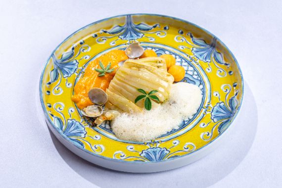 Grilled tender whole squid served with garlic-parsley oil and lemon on butterscotch coils and crispy gnocchi, imitation of beachside.