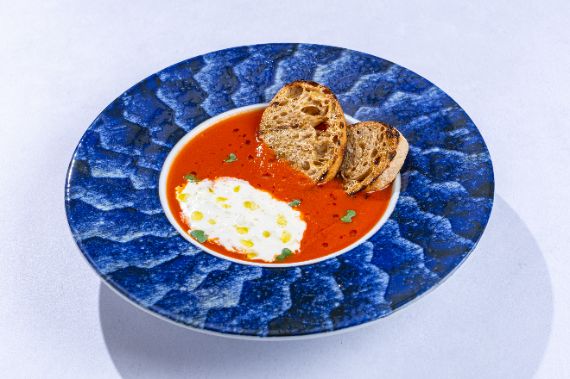 Thick Tuscan roasted tomato soup with roasted garlic, basil and extra virgin olive oil, served with creamy stracciatella cheese and grilled ciabatta bread.