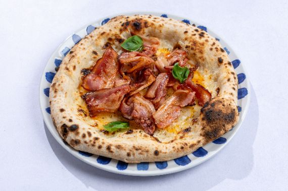 White base with provolone cheese and mascarpone, finished with speck, fresh arugula and chili oil.