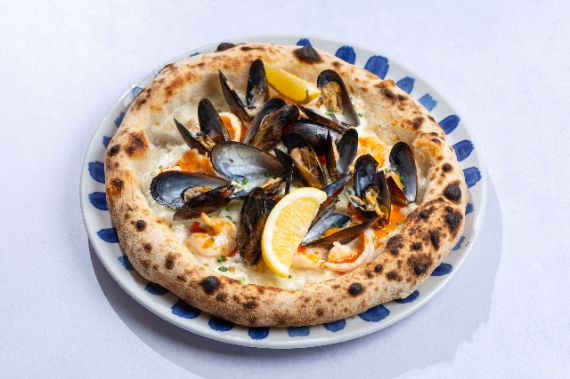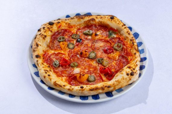 Tomato base with mozzarella and spicy salami, topped with burrata, chili oil and lemon zest.