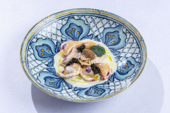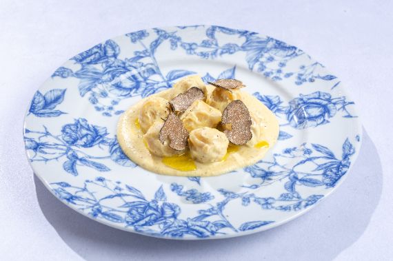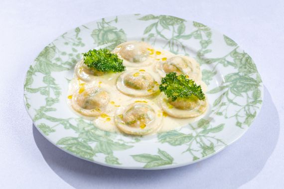Fresh ravioli filled with tru-e-scented ricotta and served in a silky butter-Parmesan emulsion.