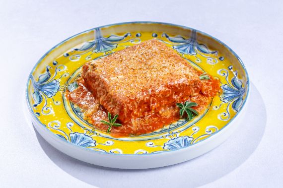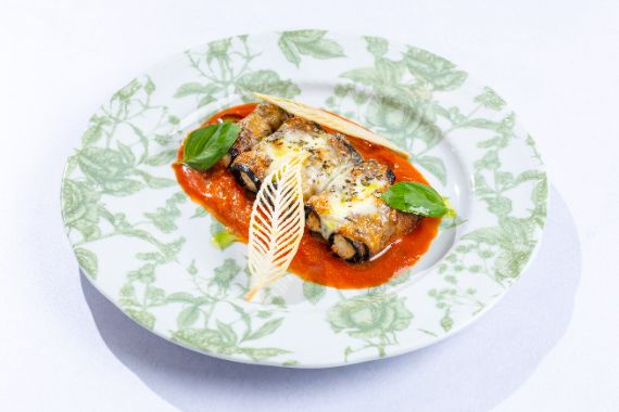 Rolled fried eggplants filled with ricotta fused with tru-e oil, baked in reduction of tomato sauce and Parmigiano and fresh mozzarella cheese.