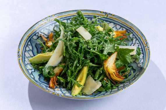 Peppery arugula with shaved Parmigiano Reggiano served with slices of avocado and fried artichoke.