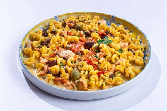 Trofie pasta in a light mascarpone and lemon sauce and reduction of roasted tomato sauce, with salmon and herbs.