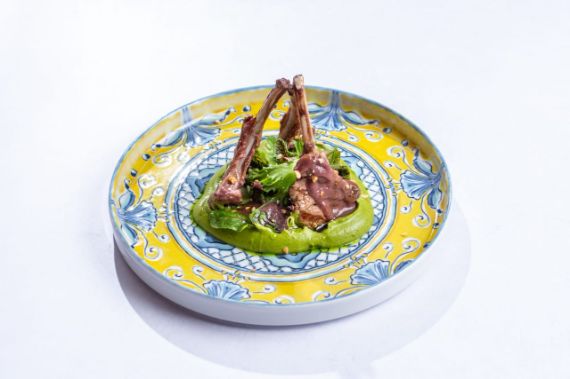 Lamb ribs cooked on a charcoal grill, served with broccoli purée and roasted red onion sauce. The dish contains peanuts.