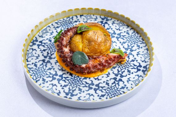 Slow-cooked octopus finished on the grill for a crisp exterior, served with smashed potato with herb oil.