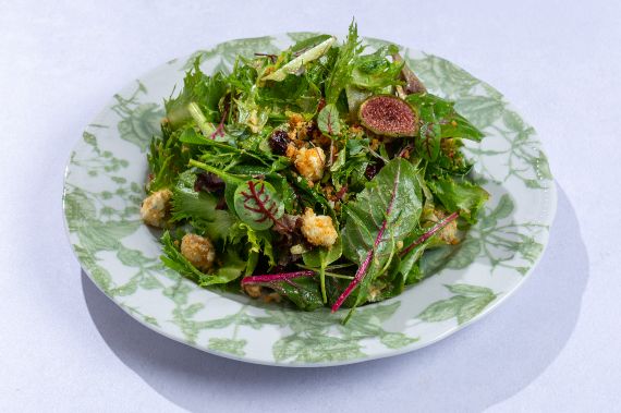 Mixed greens with walnuts and crumbled gorgonzola in a light curry vinaigrette infused with citric fruits and fresh greens