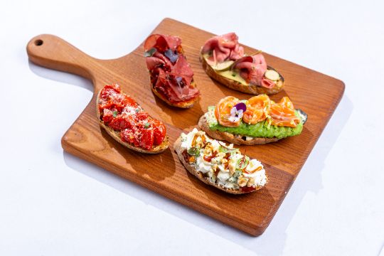Smoked salmon, lemon zest, avocado, soft cheese.
