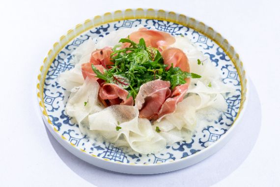 Classic pairing of sweet mellon and thinly sliced prosciutto crudo served with spicy rucola.