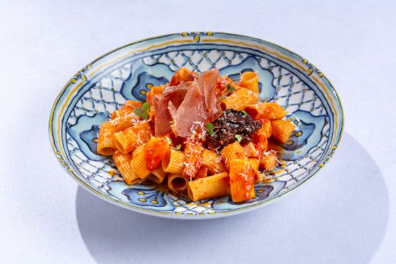 With mousse of vodka sauce and sun-dried tomatoes.