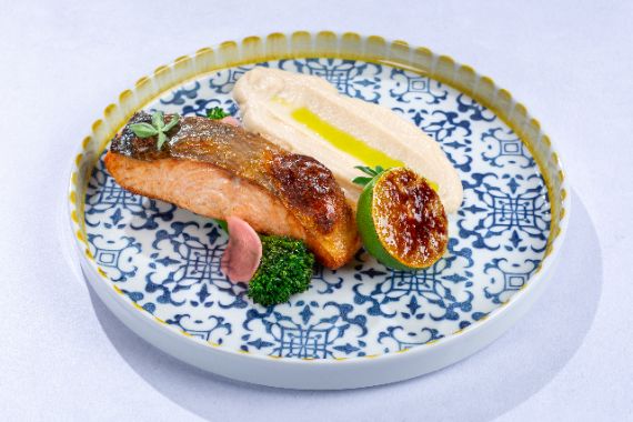 Grilled salmon fillet with thyme and citrus zest, served with caramelized lime and olive oil and broccoli with cauliflower coils.