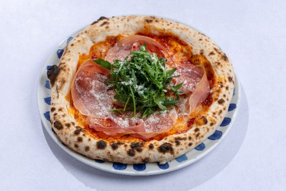 Tomato sauce, mozzarella and thinly sliced prosciutto crudo, with arugula added post-bake for tenderness.