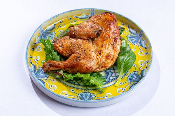 Spatchcocked chicken marinated with chili, garlic and lemon, grilled until crispy and bold in flavor served with mix greens.