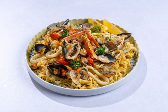 Medley of seafoods tossed with spaghetti in a garlicky tomato and white wine sauce.